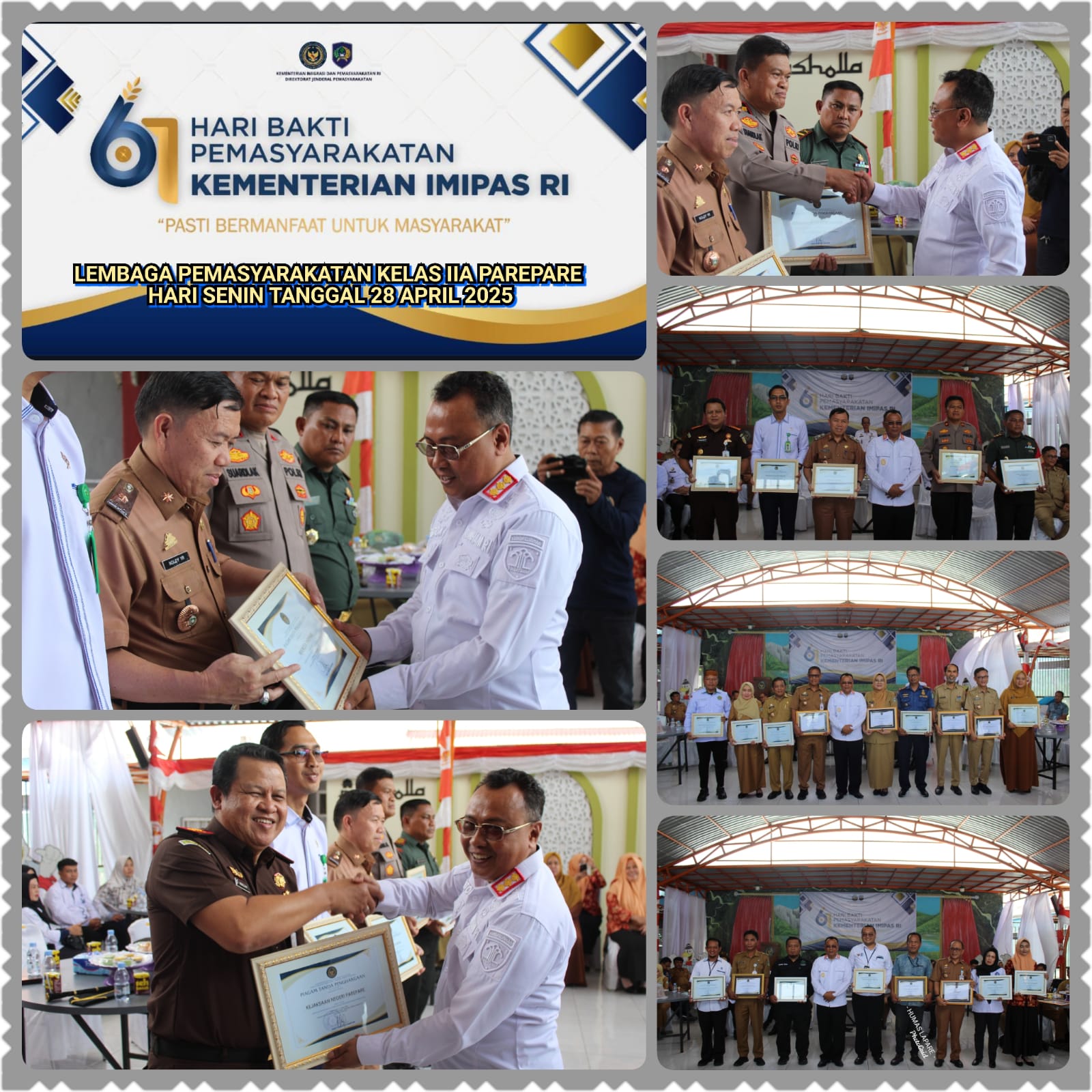 Sebagai bentuk apresiasi, Lapas IIA Parepare menyerahkan 22 piagam penghargaan kepada mitra kerja, termasuk Walikota Parepare, Polres, Kejaksaan, Kodim, Dinas Pendidikan, hingga dunia usaha. Selain itu, dibagikan 15 paket sembako sebagai wujud kepedulian sosial.