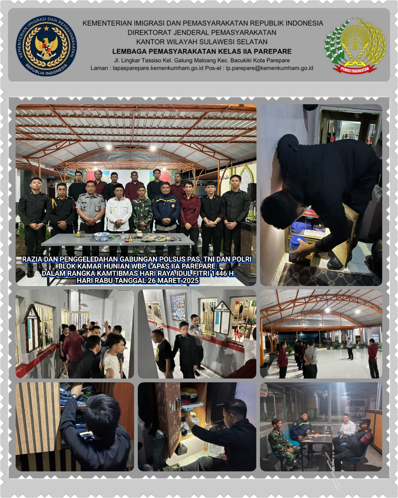 PAREPARE, timeberita.com – Menjelang hari raya idul Fitri 1446 H, pihak Lembaga Pemasyarakatan (Lapas) Kelas IIA Parepare menggelar razia dan penggeledahan secara mendadak kamar hunian Warga Binaan Pemasyarakatan (WBP) Rabu (26/03/2025) usia tarawih.