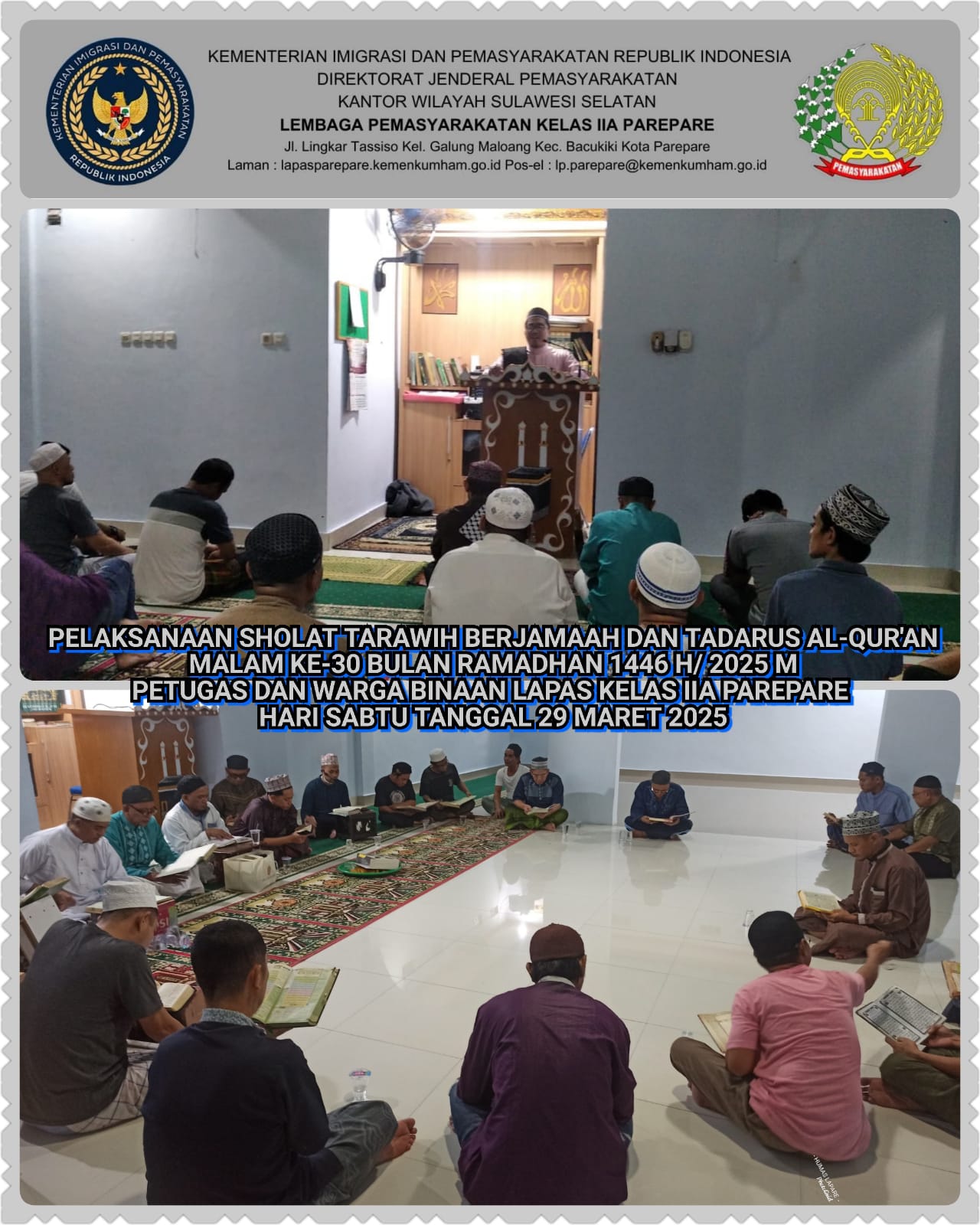 PAREPARE, timeberita.com – Kepala Lembaga Pemasyarakatan (Lapas) Kelas IIA Parepare bersama Warga Binaan Pemasyarakatan (WBP) menggelar kegiatan Khataman Al-Qur’an di Masjid At-Taubah Lapas IIA Parepare. Acara ini menandai keberhasilan WBP dan petugas dalam menyelesaikan tadarus 30 juz Al-Qur’an selama bulan suci Ramadhan 1446 H/2025 M.
