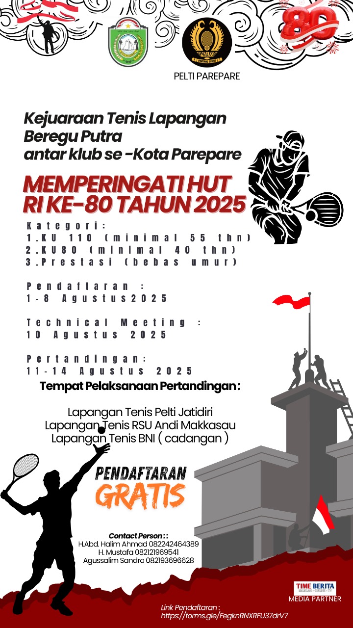 Link Pendaftaran Kejuaraan Tenis Lapangan Beregu Putra antar klub se -Kota Parepare Dalam Rangka HUT RI-80 :