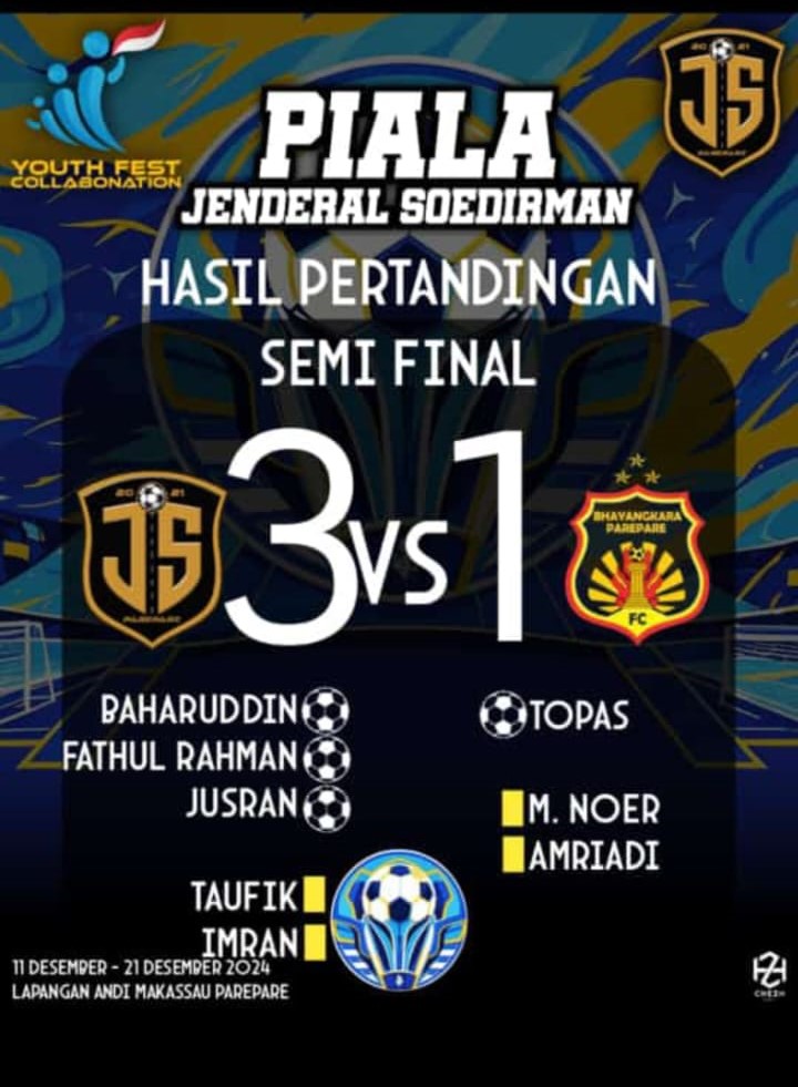 PAREPARE, timeberita.com – Laga pertandingan semifinal turnamen Jendral Sudirman Cup antara Jensud FC melawan Bhayangkara FC berakhir denga skor 3-1 dilapangan Andi Makkasau Kota Parepare, Senin (23/12/2024) sore.