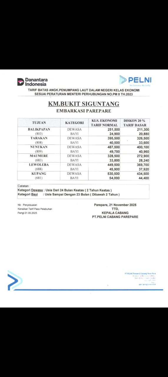 Adapun beberapa harga tiket disiapkan oleh PT Pelni Cabang Parepare diantaranya: